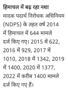 हिमाचल में नशाखोरी के आंकड़े हैरान व परेशान करने वाले हैं।समय रहते इस बिमारी का ईलाज करना बहुत जरूरी है अन्यथा देव भूमि हिमाचल उड्ता हिमाचल कहलायेगा।हालांकि हिमाचल नशाखोरी के मामले में काफी वर्षो से नशा पीड़ित होता गया है लेकिन अभी के आंकड़े कुछ ज्यादा ही हैरान करने वाले हैं–पिछले कुछ वर्षों से लगातार हिमाचल नशा के गिरफ्त कैद हो गया है जिसके आंकडे इस प्रकार हैं—–