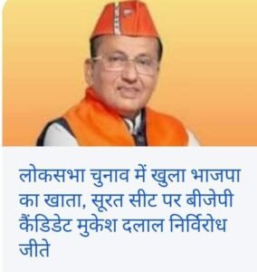 गुजरात के सूरत से भाजपा प्रत्याशी मुकेश दलाल के निर्विरोध चुने जाने पर कांग्रेस और अन्य विपक्षी दलों का तर्क-वितर्क समझ से परे है,कांग्रेस और विपक्ष सूरत के कांग्रेस प्रत्याशी के प्रस्तावक के जाली हस्ताक्षरों पर सफाई देने की जगह निर्विरोध चुने जाने को विवाद में घटीट रहे हैं जो शर्मनाक है.