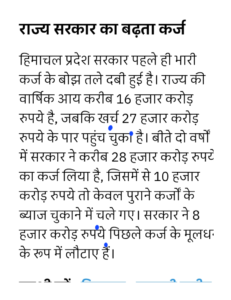 हिमाचल गंभीर आर्थिक संकट के दौर से गुज़र रहा है,सरकार की कुल आय 16 हजार करोड़ है और खर्चा 27 हजार करोड़ तक पहुंच गया है,गत दो वर्षों में सरकार ने 28 हजार करोड़ कर्ज ले चुकी है ,इस प्रकार सरकार के कुल खर्च के बराबर कर्ज ले लिया है,इस प्रकार हिमाचल सरकार 20 पैसे पैदा करने के लिये 1:30पै खर्च कर रही है.हालात आर्थिक दिवालियापन से भी बदतर हैं लेकिन आर्थिक दिवालियापन घोषित नहीं कर सकते कयोंकि ऐसा करने से सरकार को इस्तीफा देना पड़ता है..